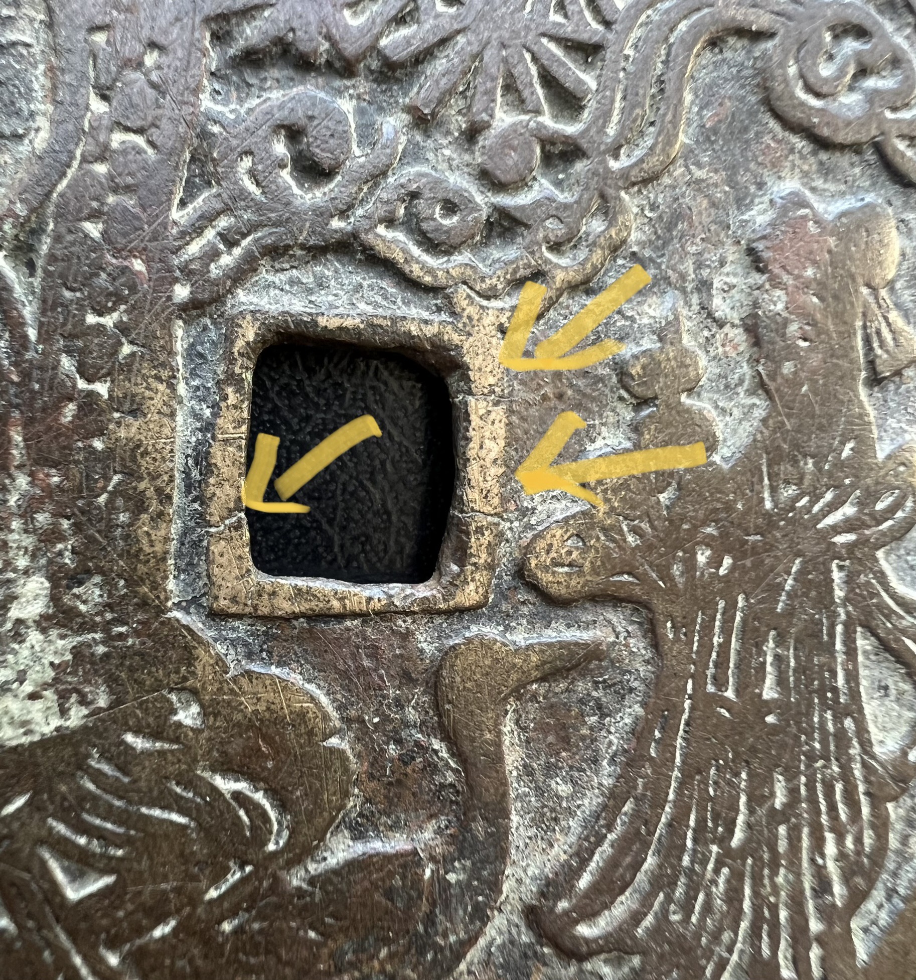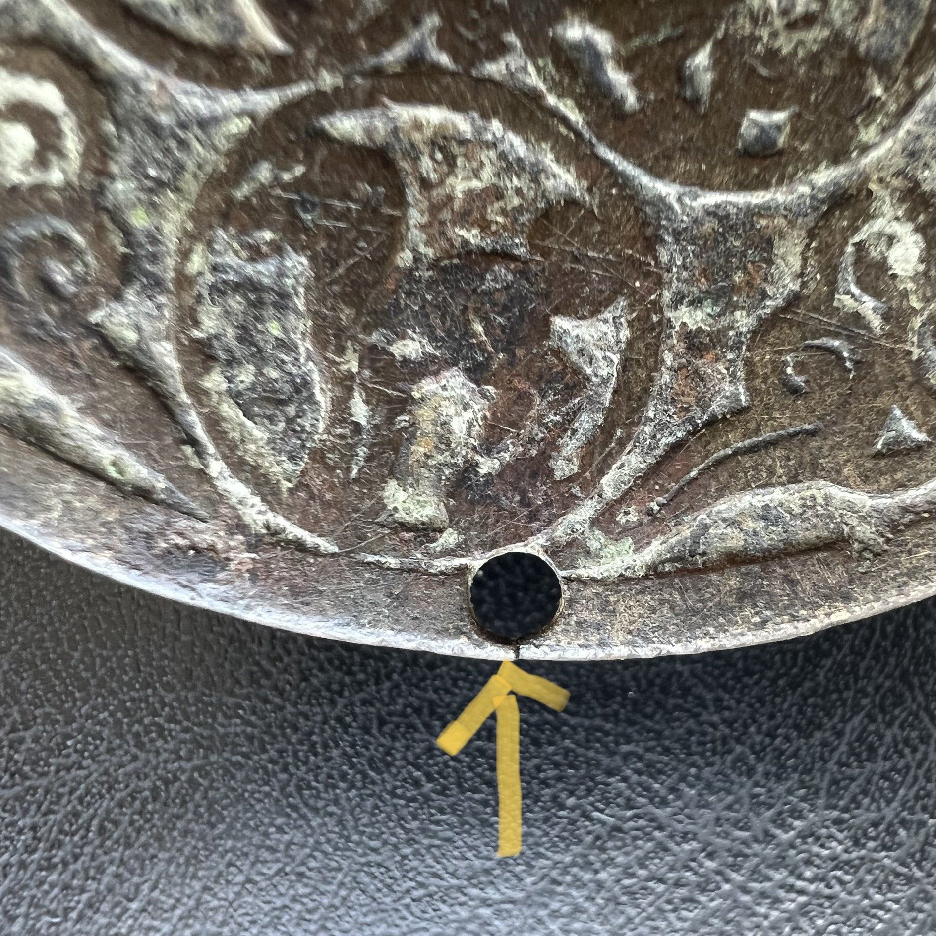 品相说明:如图,老打孔,穿口有三处牛毛裂,穿下孔有牛毛裂,见箭头处。早期花钱有微小瑕疵实属常见现象;