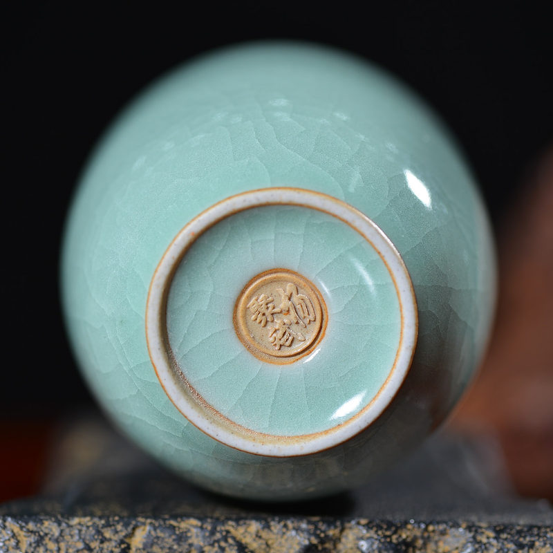 汝瓷-暖手杯-杨聚斌,采用汝州本地天然原矿石,研磨精工制作而成,做工一流,设计巧妙,杯内上满釉,开片精美,收藏使用佳品。 汝瓷—中国五大名瓷之一,创烧于北宋晚期,为宫廷御用瓷器。金灭北宋后,汝瓷也随之消亡。其开窑时间前后只有二十年,由于烧造时间短暂,传世亦不多,在南宋时,汝瓷已经非常稀有。现今存世的汝瓷,一般认为有65件,其中台北故宫博物院23件,北京故宫博物院17件,上海博物馆8件,英国戴维基金会7件,其他散藏于美、日等博物馆和私人收藏约10件。所以才有“家财万贯,不如汝瓷一片”。 作者杨聚斌出生于1962年2月,因为父亲在陵头陶瓷厂工作,因此杨聚斌自幼受父亲耳濡目染,从少年时代就形成了陶瓷情结。1980年,正式进入陵头陶瓷厂工作,开始系统学习陶瓷的烧制、配釉、造型、手拉胚等陶瓷制作技术。1990年,杨聚斌受洛阳旅游局聘请,被聘任为洛阳旅游局钧瓷厂技术厂长。1994年,杨聚斌被汝州市政府招聘到汝州市汝瓷一厂担任技术科长。1997年,企业改制后,杨聚斌自己成立了杨聚斌汝瓷工作室。 2015年6月,作品《百合洗》《鸡心碗》荣获第五届中国“大地奖"金奖。被评为非物质文化遗产传承人。