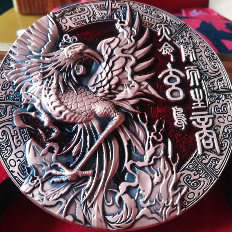 玄商紫铜高浮雕大铜章为纪念玄商拍客正式上线,北京玄商发行的首枚玄鸟生商纪念大铜章。章芯厚达6MM ,最高处13MM 直径100MM,全章重达500G 以上,双面采用镶嵌法施珐琅釉。表现出玄鸟浴火降生,无惧无畏的精神和睥睨天下的神态。此章最大发行3000枚。设计精美,工艺精湛,是投资收藏和馈赠的上选。