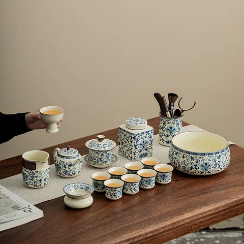 汝窑青花套装,茶旅好伴侣!这款汝窑青花旅行茶具套装,将传统与现代完美融合,无论是日常小聚还是户外旅行,都能让你的茶时光更加惬意。便携式茶具套装,轻巧易带,无论居家或旅行,都能随时随地享受茶的乐趣。历史韵味与现代审美的结合,手感细腻,茶香四溢。这款茶具套装将传统汝瓷的温润与青花的雅致完美结合,带给你不一样的茶旅体验。