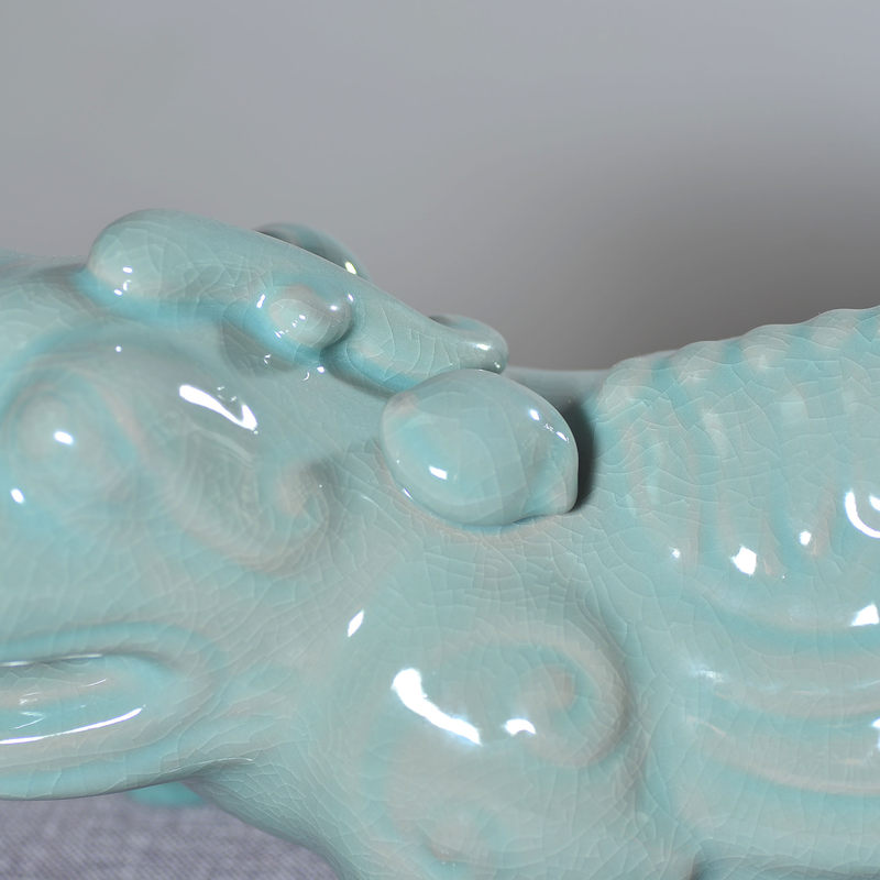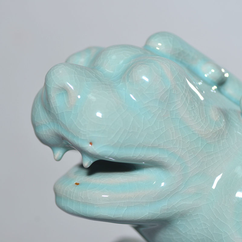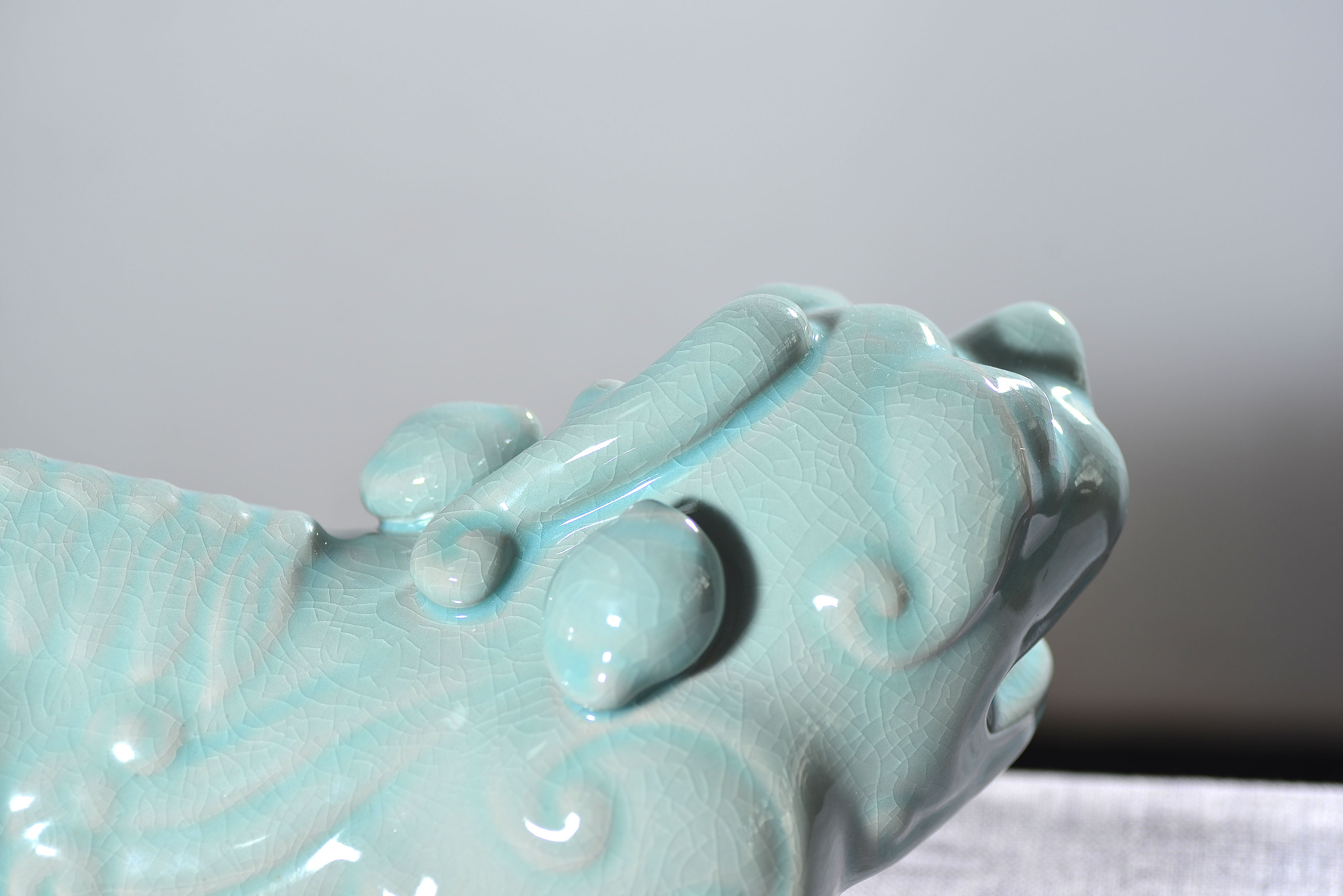 清凉寺仿古釉天青色 招财貔貅 长42厘米 高23厘米 有轻微缩釉和瑕疵。清凉寺汝瓷是中国北宋时期的主要代表瓷之一,属于五大名窑之一。清凉寺汝瓷的历史可以追溯到北宋时期,当时的宋王朝为了满足宫廷的特殊需要,设立了汝官窑。这个窑场生产的汝瓷以其独特的美学风格和高*的制作工艺而闻名,被视为青瓷之典范。清凉寺汝官窑遗址是在上世纪被发现的,这一发现揭开了汝官窑消失的千古之谜。自1987年以来,河南省文物考古研究所对清凉寺汝窑遗址进行了多次发掘,发现了大量重要的烧造设施和汝窑瓷器标本。清凉寺汝瓷的艺术特色体现在其独特的制作工艺和美学风格上。它以其工艺精湛、造型秀美、釉面蕴润、高雅素净的丰韵而独具风采。汝瓷的制作工艺包括使用名贵玛瑙为釉,釉色独特,随光变幻,呈现出“雨过天晴云破处”“千峰碧波翠色来”的美妙效果。此外,汝瓷的胎体厚重,釉厚而声如磬。汝瓷的形状古朴大方,器表呈蝉翼纹细小开片,具有“梨皮、蟹爪、芝麻花”的特点。这些装饰手法使得汝瓷不仅美观而且富有变化,被世人称为“似玉、非玉、而胜玉”。