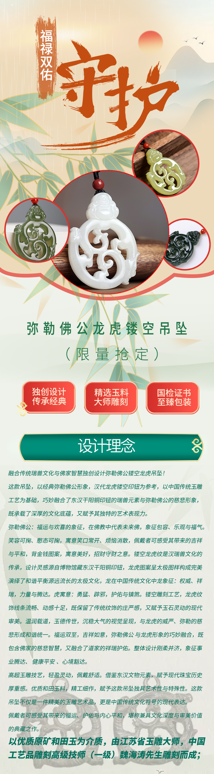 1弥勒佛公龙虎镂空吊坠 本场迎新春特别拍卖会汇聚王者老师指导设计的几件守护——弥勒佛公龙虎镂空吊坠,其中5件且末蓝调款为春节定制;白玉、红玛瑙、黑青、青白玉几款为守护吊坠设计原型样品,未公开发行!!值此新春佳节,本场拍品全部无底价起拍,成交拍品均会赠送一份特别新年好礼,钜惠迎新,吉祥到家!马年大吉! 说明:贵重物品,为了保证快递时效及物品安全,本场成交拍品如需年前发货请联系官方客服确认!!